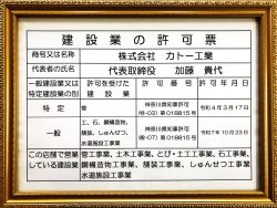 | 保有資格者 | 1級管工事施工管理技術者、1級土木工事業施工管理技術者、浄化槽設備士 給水装置工事主任技術者、排水設備工事責任技術者 福祉住環境コーディネーター(2級)、TOTO和洋リモデル認定施工店 |